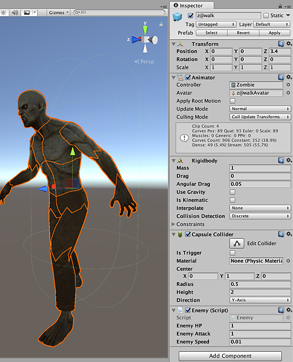 前回Enemyクラスを作成したときは仮モデルとしてキューブオブジェクトを使用したが、今回はz@walkにEnemyクラスをアサインする。Enemy Speedは0.01前後がちょうどいいだろう。このEnemyクラスでは衝突検知のためにコライダとリジッドボディコンポーネントを使用するため、それらもアサインしておこう。今回のような縦に長い形状のキャラクターにはCapsule Colliderを設定するのが一般的だ。コライダのサイズ調整も忘れずに。RigidbodyはUse Gravityのチェックを外しておこう(図11)。これで試しにゲームを実行してみると、キャラクターが歩きながらカメラ(プレイヤー)に近づいてくるのが確認できるはずだ。