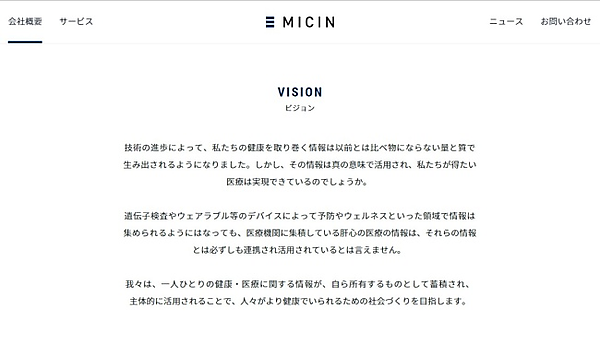MICINのWebサイトでは、会社のビジョンとして「個人の健康・医療に関する情報を自ら所有・蓄積し、主体的に活用することで、より健康でいられるための社会づくりを目指す」ことを掲げています。この分野で進んでいる米国では、Googleとスタンフォード大学が共同研究を進めていますし、海外のいくつかの国では医療情報を一元管理して利用できる体制作りを進めていますが、日本はまだまだ遅れています。