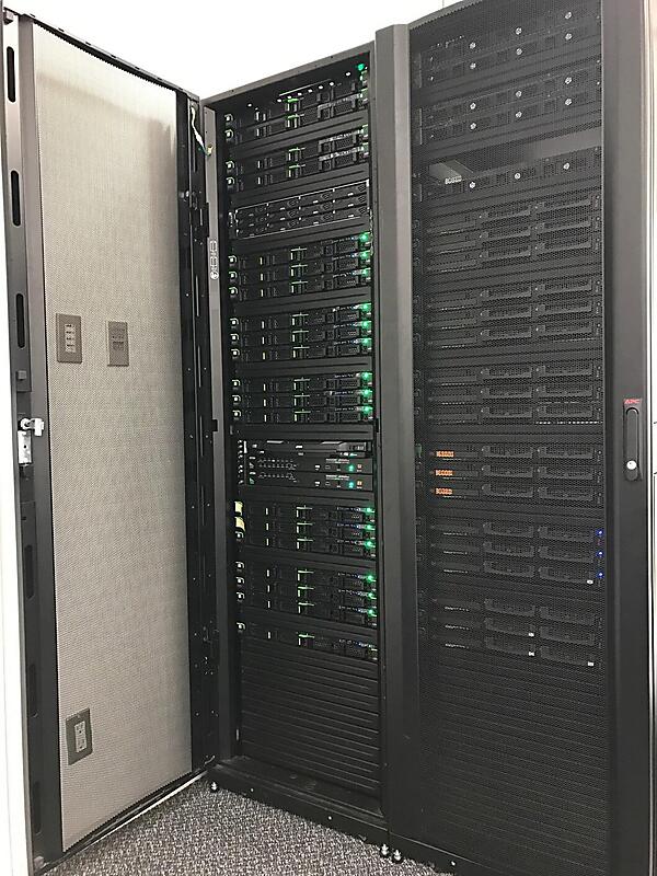 企業のシステムは通常、データセンタや企業内のサーバルームに設置されますが、その際に「効率良くハードウェアを設置できるように」と規格化された収納製品のことです。通常は大型冷蔵庫のような大きさがあり、設置したい機器を支柱などに固定して収納していきます(図3は弊社の研修室に設置されたラック。研修用のサーバが整然と収納されている)。