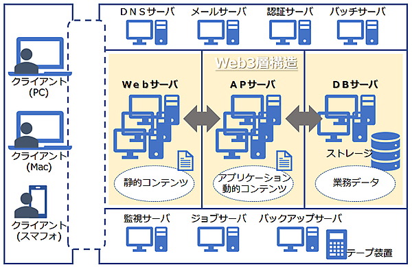 上記の3つのサーバを中心に、さらにユーザー認証が必要なシステムであれば「認証サーバ」や監視・ジョブ管理などを行う「運用関連サーバ」などが周辺を固めていきます。また、それぞれのサーバを接続したり、アクセスを制御したりするために各種のネットワーク機器やセキュリティ機器が配置されていきます。