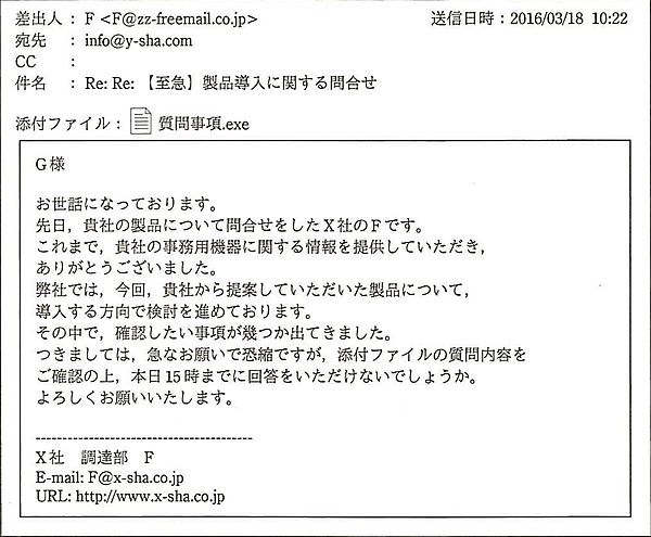 設問1は標的型攻撃メールの受信を防ぐために、「受信メールの制限」をする問題です。標的型攻撃メールの多くは送信元を詐称して受信者を騙します。例えば、平成28年度 春期情報セキュリティマネジメント試験 午後Ⅰ問題の問1に出てくる標的型攻撃メール(図1)では、差出人のメールアドレスにフリーメールアドレスが使われており、本文下の署名欄にあるメールアドレスと異なっています。
