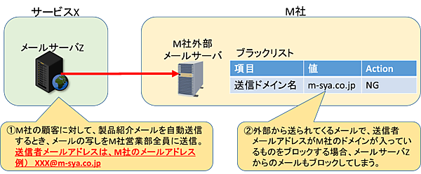 設問1(1)では、フィルタリングルール(図2)としてブラックリストにM社のドメインを設定すると「正規のメールも一部届かなくなる」ことが指摘されており、それがどのような場合に発生するかが問われています。