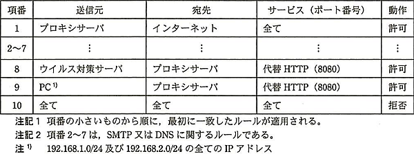 設問2(1)では、問題文中の「マルウェアY」のバックドア通信の説明の中に、まず「プロキシサーバを経由せずに、TCPポート番号8050を使用して、アクセスする」とあります。そこで、M社のFWのフィルタリングルール(図4)を見てみます。