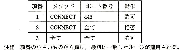 図5のアクセス制御ルールを見る限り、HTTPのCONNECTメソッドを使用して接続する場合はポート番号443(https)しか許可されていません。したがって、項番1と2の間に追加するルールはCONNECTメソッドで許可しなければならないポートがあり、その通信を行う業務を解答すればよいことになります。よって、HTTPのCONNECTメソッドについて記載がある、営業部の「顧客管理」業務で使用するCONNECTメソッドでの「ポート番号2650」を「許可」する必要があることが分かります。
