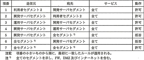 現状の設定では、利用者セグメント2(開発部)から開発サーバセグメントへのアクセスはすべて許可されています。よって、開発部のPCがマルウェアに感染すると開発サーバセグメントへアクセスされる可能性があります。開発専用PCを開発サーバセグメント内に置き、利用者セグメント2(開発部)からアクセスできないようにすればネットワーク分離が実現できるため、設問3(1)の解答は「利用者セグメント2から開発サーバセグメントへの通信を拒否にする」となります。