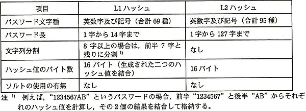 LMハッシュは昔のMicrosoftのOSであるLAN ManagerやWindows 95/NT等のパスワードを保存するために使われていたハッシュ関数です。パスワード長が最大14文字まで、またパスワードハッシュ作成時に7文字ずつ分割するため、7文字ごとに解析できる脆弱性があります。よって、Windows Vista以降のOSは既定値でLMハッシュを保存しないようになっています(既定値を変更すれば保存できます)。