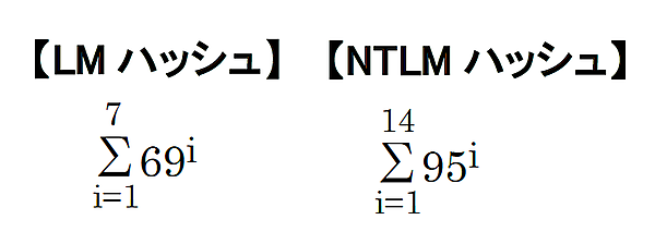 というようにパスワードが7文字の時まで考え、その合計値を求めればよいので、LMハッシュとNTLMハッシュの計算式は下記のようになります。