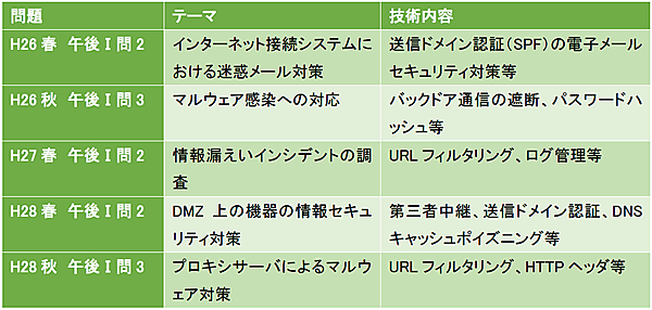 ちなみに、「情報セキュリティ10大脅威 2017」の組織編で第1位となったのは昨年に引き続き「標的型攻撃による情報流出」でした。標的型攻撃については、ここ数年情報セキュリティスペシャリストの午後Ⅰ試験においても、ほぼ毎回出題されています(表)。