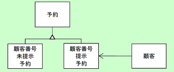 〔現行業務の分析結果〕4.(4)に「予約に必要な情報は,顧客の基本情報(後述),宿泊プラン,客室タイプ,宿泊開始日,泊数,1客室当たりの人数,客室数である。」とあります。また、〔現行業務の分析結果〕5.(1)に「氏名,かな氏名,メールアドレス,電話番号などの基本情報を登録した顧客には,顧客番号を付けて一元管理する。」、(2)に「顧客は予約のときに顧客番号を提示することで,基本情報を提示する必要がなくなる。」と記載されています。ところが、図2のテーブル「予約」の属性には顧客の基本情報や顧客番号は含まれていません。これらのことから、テーブル「予約」はスーパタイプであり、基本情報を含むサブタイプと、顧客番号を含むサブタイプがあると考えられます。あとはサブタイプ名ですが、図2のテーブル「宿泊」の属性「顧客番号提示未提示区分」より、基本情報を含むサブタイプ名を「顧客番号未提示予約」、顧客番号を含むサブタイプ名を「顧客番号提示予約」とします。さらに、「顧客番号提示予約」の属性「顧客番号」はテーブル「顧客」の主キーを参照することで、テーブル「顧客」と「顧客番号提示予約」の間に関連を持たせます。