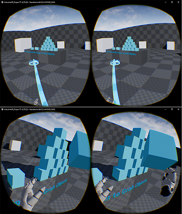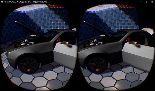 図12はサンプルマッププレイ時のスクリーンショットですが、画面の左右で微妙に描画がずれていることが分かると思います。これは擬似的な「視差」を表現して、人間にVR空間を「より立体的なもの」と認識させるためです。
