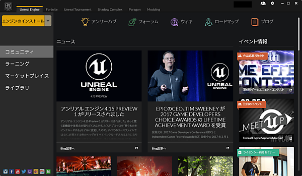 ログインすると図4のような画面が表示されるので、画面左上の「Unreal Engine」タブを選択してUnreal Engineのホーム画面を表示します。