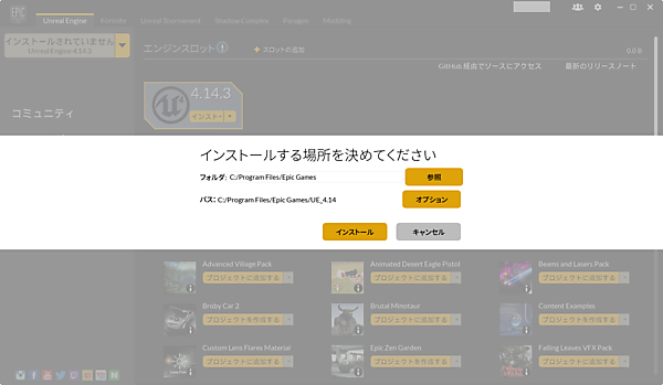 まず、インストール場所を決めます(図5)。任意の場所を参照、もしくは直接入力して「インストール」を押しましょう。「オプション」ではUE4で使用できる様々なコンポ―テントを選択してインストールできますが、まずはデフォルトのままで問題ありません。