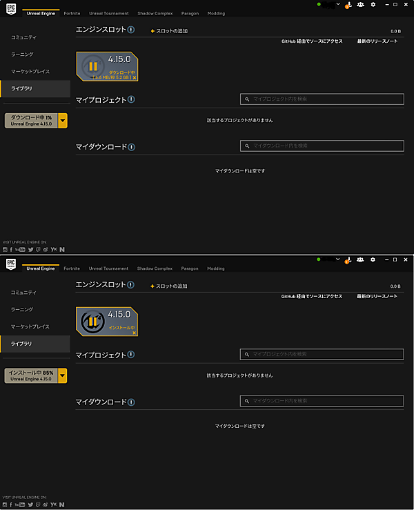 ここで画面左上の「エンジンのインストール」ボタンクリックするとUE4のインストールが開始されます。