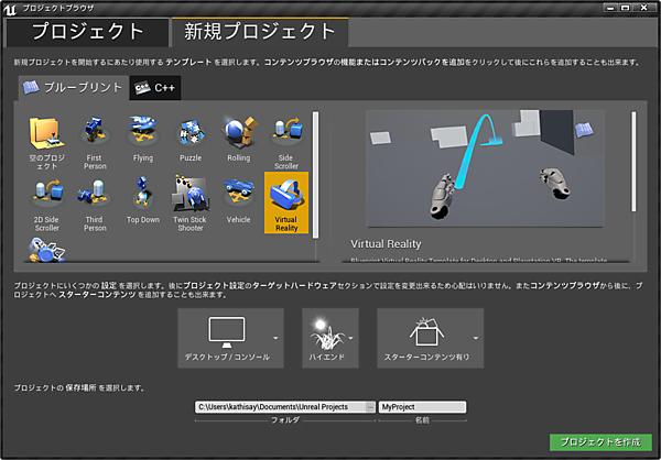 ここで、試しにサンプルプロジェクトを作ってみましょう。インストール完了後に表示される「起動」ボタンを押してUE4を起動します。「新規プロジェクト」の作成画面(図8)が表示されるので、「VirtualReality」を選択して「プロジェクトを作成」ボタンを押してください。