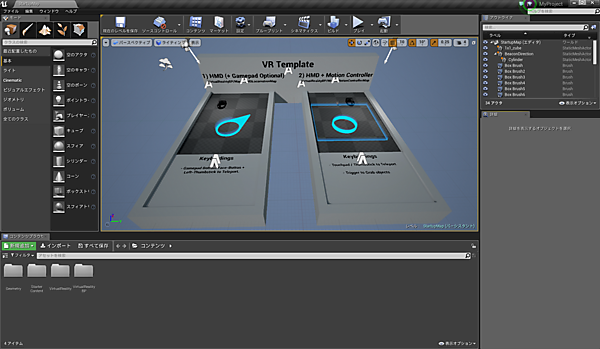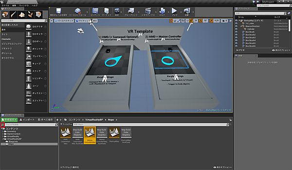 UE4には、モーションコントローラーによる操作やVR空間での移動処理が組み込まれたVR開発用のサンプルプロジェクトがあらかじめ用意されており、驚くほど簡単にVR開発を始めることができます。