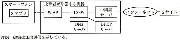 また、設問には「W-APの設定上の細工を具体的に述べよ」とあるので、無線LANの設定について触れる必要があります。自動的に攻撃者のW-APにアクセスするということは、攻撃者はユーザに設定されている公衆無線LANのSSID(Service Set Identifier)と同じ名前のW-APを用意する必要があります。そうすれば、ユーザのスマートフォンが公衆無線LANのアクセスポイントと間違えて攻撃者のW-APにアクセスしてきます。ただし、公衆無線LANは暗号化設定されていることが多いため、攻撃者のW-APの暗号化設定が公衆無線LANと異なると攻撃者のW-APと通信できません。攻撃者のW-APにも公衆無線LANと同一の暗号化方式を設定し、また暗号に必要な既知共有鍵(Pre-Shared Key)も同じ文字列に設定しておけば、ユーザのスマートフォンは自動的に攻撃者のW-APに接続されることになります。よって、解答は「SSID、暗号化方式と事前共有鍵に、公衆無線LANで使用されているものを設定する」となります。