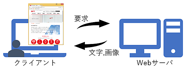Webページを閲覧する時のことを思い出してほしいのですが、パソコン(クライアント端末)のブラウザで直接URLを打ち込んだりGoogleで検索をしたりすると思います。閲覧要求が発生すると、その要求がネットワークを通じてWebサーバまで運ばれ、Webサーバはその要求に従ってコンテンツ(文字や画像)を返し、クライアントは受け取ったコンテンツを表示します(図1)。
