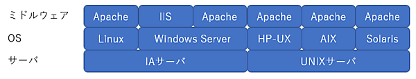 HP社が提供し、大規模なシステムや重要なサーバでの採用実績が多くあるため「信頼性が高いOS」と言われています。その分導入費用も高くコストがデメリットですが、フロントサーバ(Webサーバ、APサーバ)はLinux、DBサーバはHP-UXという組み合わせもよくある構成です。 - AIX
