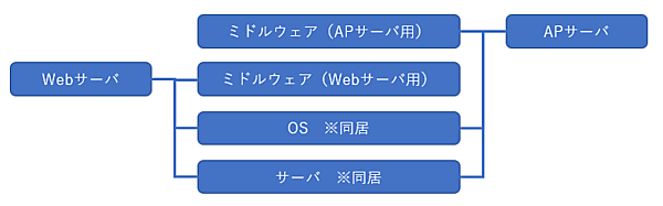 同じ物理サーバ上にWebサーバとAPサーバが同居する構成もよく見られます。この構成では物理サーバとOSを共有していますが、Webサーバ用のミドルウェアとAPサーバ用のミドルウェアを導入することで2つの役割を持たせています(図4)。