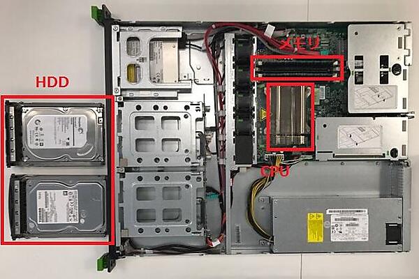 図5は物理サーバの内部を上から撮影したものです。パソコンと比べて堅牢さを感じるのではないでしょうか。搭載されているCPU・メモリ・ハードディスク(以下、HDD)といったパーツには高性能・大容量のものを使用しています。