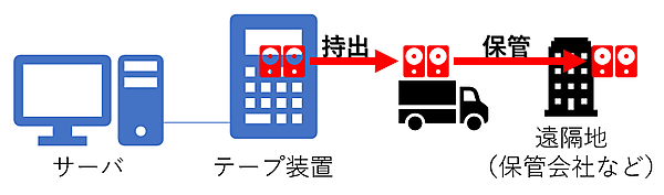 テープ装置は、ストレージ装置と同様に「データ保存に特化した装置」です。ストレージ装置は装置内部に搭載されたHDDにデータを保存しますが、テープ装置は装置内部に装填されたテープメディアにデータを保存します。主にバックアップをターゲットにした装置でテープメディアを取り出すこともできるため、システムとは別の場所に保管して災害などからデータを守るという考え方を取り入れているシステムもあります(図10)。