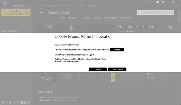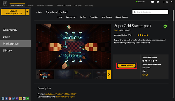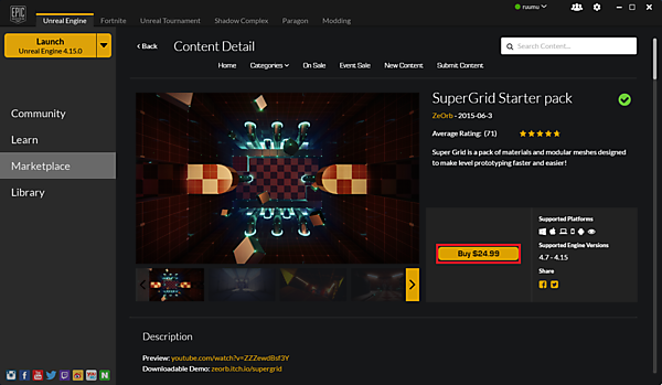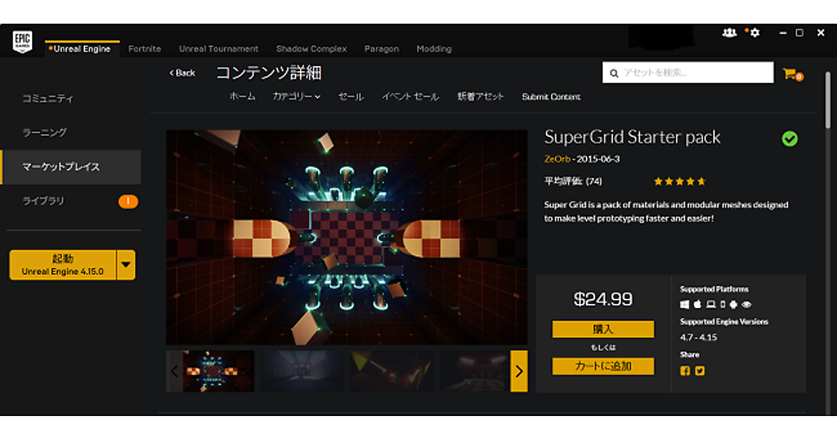 まずは、前回インストールした「Epic Launcher」の左側にあるメニューから「マーケットプレイス」を選択し、「SuperGrid Starter pack」を購入してください(今回はコンテンツの見栄えを良くするため、およびアセットの使い方を学習するために有料アセットを使用していますが、コンテンツ開発を行う上でどうしてもアセットが必要ということはないので、無理に購入する必要はありません)。