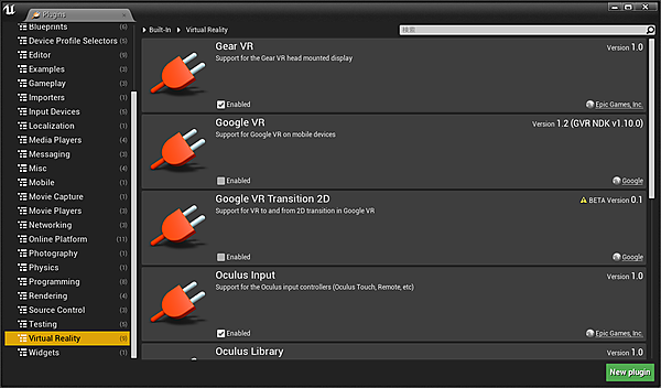 ここでは、VRのプラグインを設定できます。今回はVRサンプルプロジェクトを使用しているので、始めからOculusとViveのプラグインは有効になっているため特に設定する必要はありませんが、Google DayDreamやPSVRでデバッグを行う場合は、プラグインを適宜有効化してください。