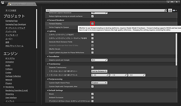 Forward Shadingを設定すると、レンダリングパスがデフォルトのディファードからフォワードに切り替わります。