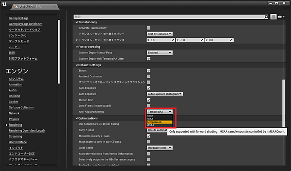 「アンチエイリアス」の略で、3Dオブジェクトを表示した際に出るジャギー(ピクセルのギザギザ)を目立たなくする処理です。TemporalAA(TXAA)、FXAAなど様々な手法があり、日々新たな手法も開発されていますが、現状はUE4でVRコンテンツを開発する場合はMSAAを選択するのが最適です。