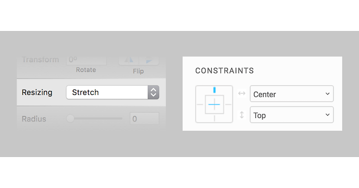 左:Sketchの「group resizing」機能は1つのドロップダウンメニューで設定され慣れるまで少し時間がかかります。