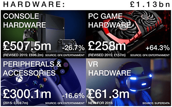 英国のビデオゲーム/インタラクティブ・エンターテイメント業界の団体組織であるUkieより、2016年の英国のゲーム市場報告が公開されました。本報告によると、2016年の英国のゲーム市場規模は43億3,000万ポンド(約6,060億円)であり、この内の6,130万ポンド(約85億円)をVRが占めることが明らかにされました。