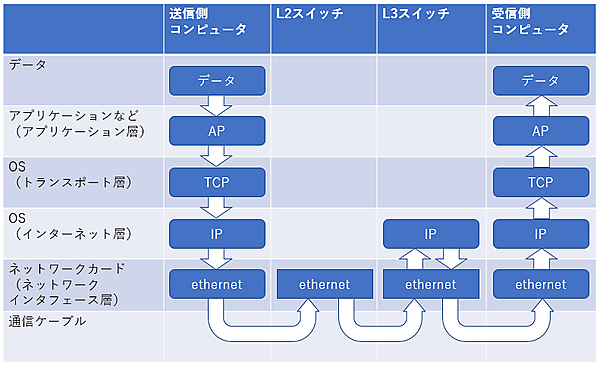 コンピュータやネットワーク機器を接続してLANを組む際に使用します。最近のシステムではL2スイッチとL3スイッチがよく使用されます。L2スイッチはネットワークインタフェース層までの処理を、L3スイッチはインターネット層までの処理を担当します(図9)。
