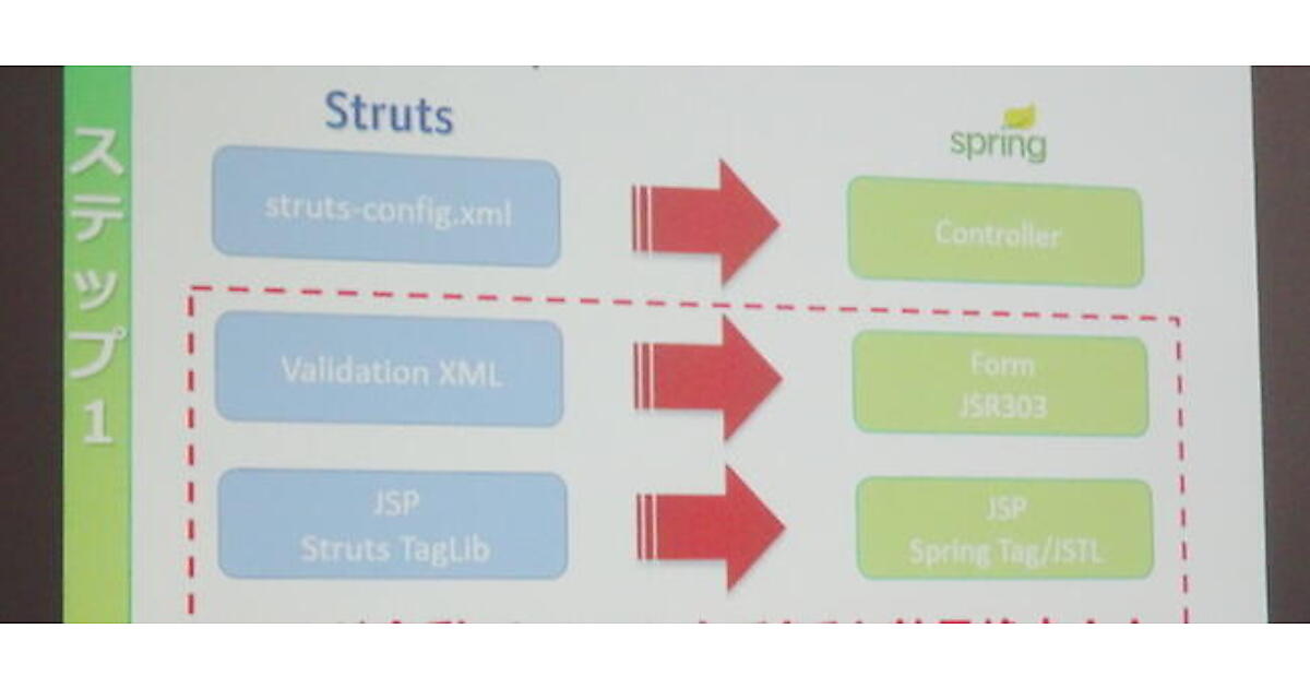 移行先としてはまず、Struts 2、Java EE、Springの3つの選択肢が示された。このうち、Struts 2はStruts 1との互換性がないうえ脆弱性に不安があること、Java EEはモデルもカバー範囲も違って移行しにくいことがネガティブ要因として挙げられた。