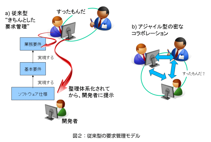“欲しいモノ”と、“手に入ったモノ”とのギャップが、アジャイルへの関心を集める理由のひとつであることは、疑う余地もありません。要件をだす側と開発側とのコラボレーションに関して、アジャイルが従来のやり方と異なるのは、「要求定義活動の成果物に対する、詳細度・完成度の考え方」ではないでしょうか?