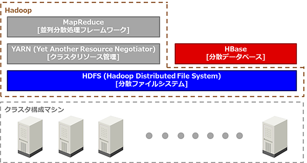 「Apache Hadoop」(以降、Hadoop)は、デファクトスタンダードになっているビッグデータ向けの処理基盤です。HBaseはHadoopのエコシステムを構成するOSSの1つで、Hadoopの分散ファイルシステムであるHDFS上に構築する分散データベースです。