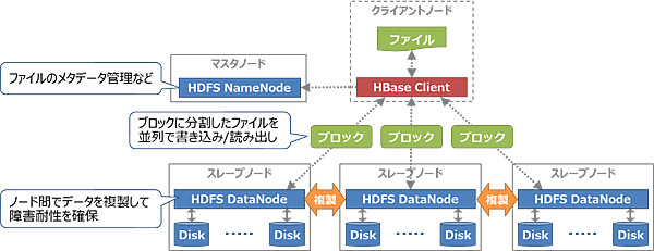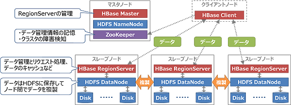 HBaseのシステム構成を図6に、またHBaseとその周辺コンポーネントの説明を表1に示します。HBaseはマスタ・スレーブ型の構成で、クラスタ全体を管理するマスタノードとデータを管理するスレーブノードで構成します。スレーブノードではHBaseのRegionServerがデータの管理とリクエスト処理、およびデータのキャッシュを行い、HDFSがデータの永続化を行います。HBaseとHDFSが同じノードに同居することでデータの管理と保存をスムーズに行えます。また、HDFSに保存されたデータはノード間で複製されるため、スレーブノードに障害が発生してもデータが失われる可能性は低いと言えます。