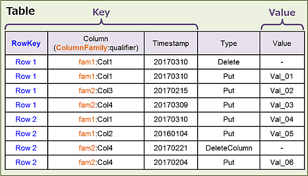 | 2 | Delete | RowKey、Column、TimestampがこのRowと一致するキーバリューを削除されたものと見なす |