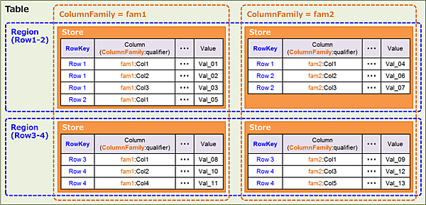 Tableが物理的にどのように分割されるのかを図10に示します。TableのキーバリューはRowKeyの範囲でRegionという単位に分割され、Region内のデータはColumnFamily単位でStoreという単位に分割されます。Store内の各キーバリューはMemStore(メモリ上にStoreごとに1個存在)またはHFile(HDFS上にStoreごとに複数存在)に保持されます。