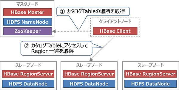 - HBase ClientがZooKeeperにアクセスし、カタログTable(HBaseが保持する全データの管理情報)の格納先RegionServerを確認する