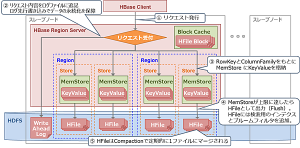 HBaseはRegionという単位でデータを分散し、各スレーブノードのRegionServerにRegionを割り当てることでデータの書き込み/読み出しを分散処理します(図7)。そのため、スレーブノードを追加すると処理性能とディスク容量が向上します。各RegionはRegionServerのメモリ上にデータのキャッシュを持ち、データの実体はHDFS上にファイルとして格納します。