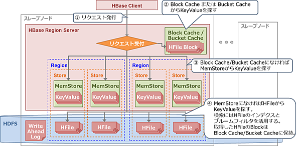 - RegionServerは、Block Cache*2およびBucket Cache*3から目的のキーバリューを探す