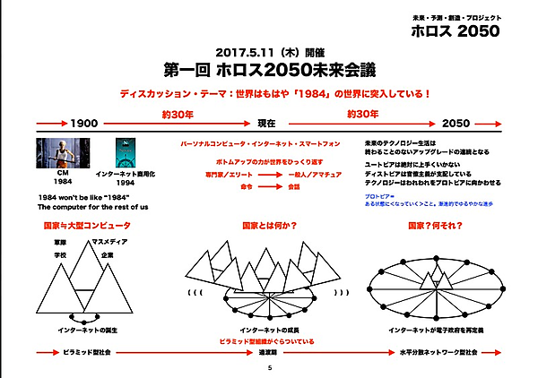 ホロス2050未来会議の開催趣旨は、同書に登場する12のキーワードを手掛かりに、「30年後の未来を考えていこう」というものだ。第1回のテーマは同書に登場した「ディストピアは無法地帯というよりも息が詰まる官僚主義が支配している」という言葉を手掛かりに、インターネットが発達普及してきたこの30年の後に「なぜ世界的な国家主義の台頭と上からの管理社会化が進行しているのか」を考察し、ディスカッションした。
