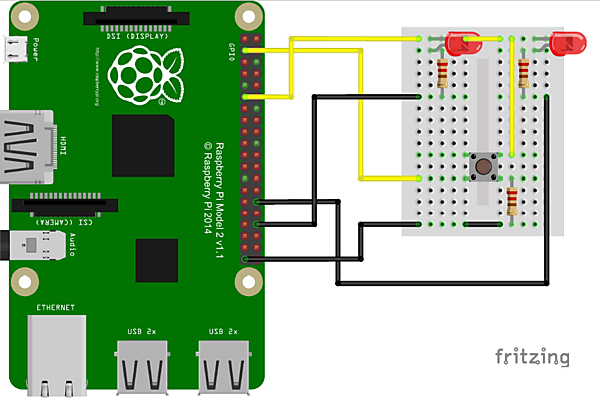 VNC環境が準備できたら、はじめにシミュレーションをしてみましょう。第1回でインストールした「fritzing」を起動して、以下のような配線図を作成します(fritzingのダウンロードとインストール、使い方については第1回を参照)。