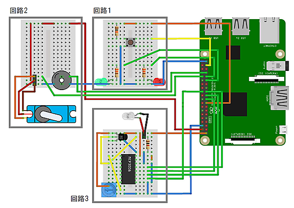 配線図が完成したら、いよいよ実際に電子工作をしていきます。配線図や下記の全体図を参考にやってみてください。なお、ここでの作業は第1回の内容と近いので、やりやすいと思います。
