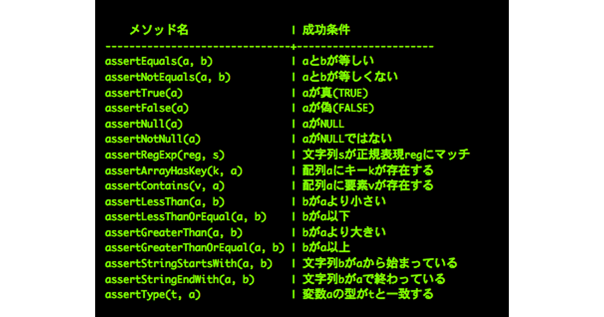 メソッド名 | 成功条件 -------------------------------+----------------------- assertEquals(a, b) | aとbが等しい assertNotEquals(a, b) | aとbが等しくない assertTrue(a) | aが真(TRUE) assertFalse(a) | aが偽(FALSE) assertNull(a) | aがNULL assertNotNull(a) | aがNULLではない assertRegExp(reg, s) | 文字列sが正規表現regにマッチ assertArrayHasKey(k, a) | 配列aにキーkが存在する assertContains(v, a) | 配列aに要素vが存在する assertLessThan(a, b) | bがaより小さい assertLessThanOrEqual(a, b) | bがa以下 assertGreaterThan(a, b) | bがaより大きい assertGreaterThanOrEqual(a, b) | bがa以上 assertStringStartsWith(a, b) | 文字列bがaから始まっている assertStringEndWith(a, b) | 文字列bがaで終わっている assertType(t, a) | 変数aの型がtと一致する |