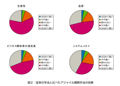 米国のあるソフトウエア会社が独自にアンケート調査した結果によると、回答者の70%近くがアジャイルを導入していると回答しています。また、回答者の多数が、アジャイル開発に関して、生産性、品質、ユーザーの満足度、システム・コストの面で好意的な評価をしています。