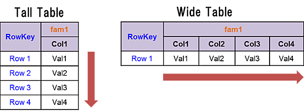 Tableの設計方針にはTall TableとWide Tableの2種類があります。Tall TableではRowを増やす方向にデータを格納していきます。一方、Wide Tableでは1個のRowの中でColumnを増やす方向にデータを格納していきます(図3)。