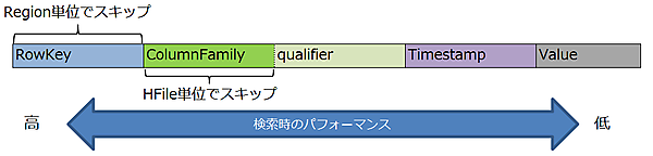 HBaseのデータはRowKeyとColumn(ColumnFamily:qualifier)にインデクスが付加されます(図4)。そのため、検索条件として使いたい値をここにマッピングすることで効率的に値を取得できます。なお、TimestampやValueでも検索は可能ですが、インデクスがないためScanの範囲が広くなってしまいます。