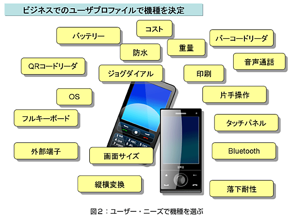 また、端末選択は、業務上片手で操作する必要があるのか、フル・キーボードが必要なのか、縦横変換が必要なのか、堅牢(けんろう)性が求められるのか、など、 利用者の要求/プロファイルをもとにして選択すべきものです。