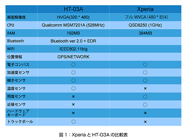 HT-03AとXperiaのスペックや搭載デバイスをまとめてみると(図1)、2機種の差は一目瞭然(りょうぜん)です。